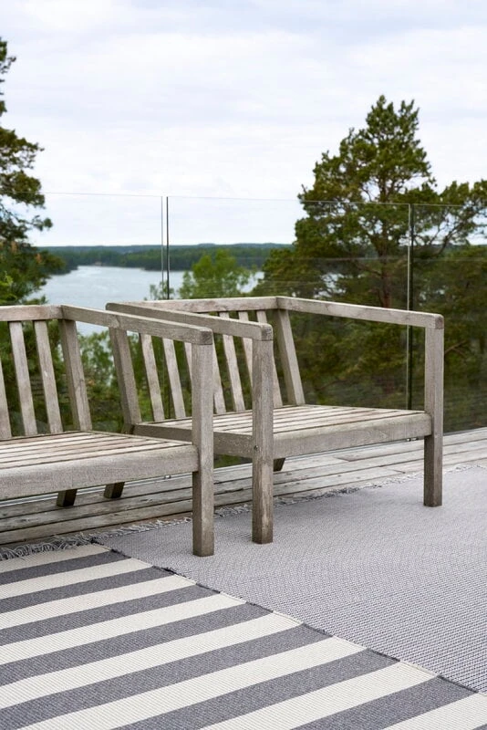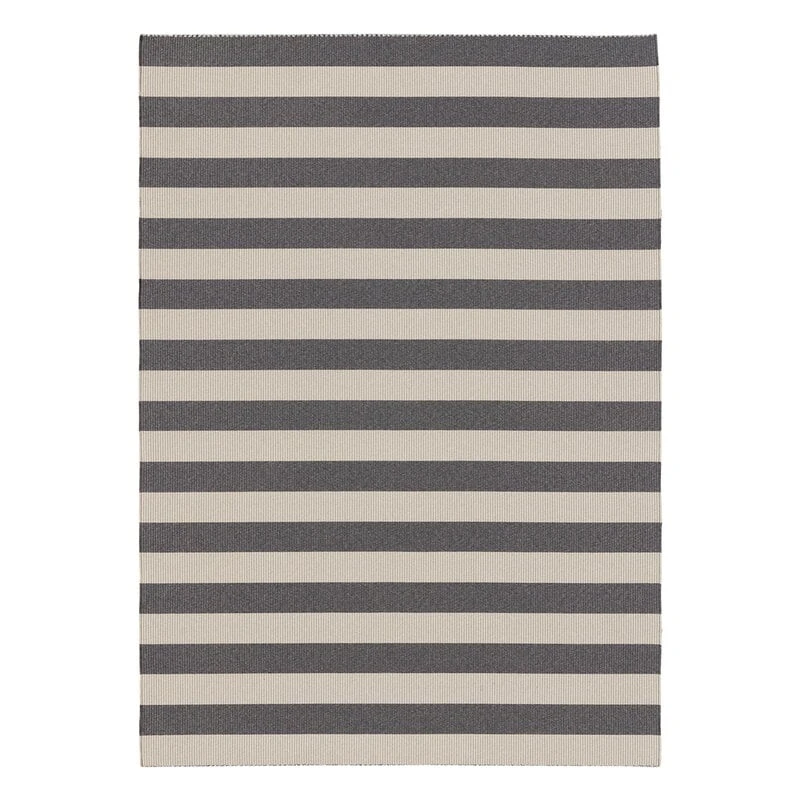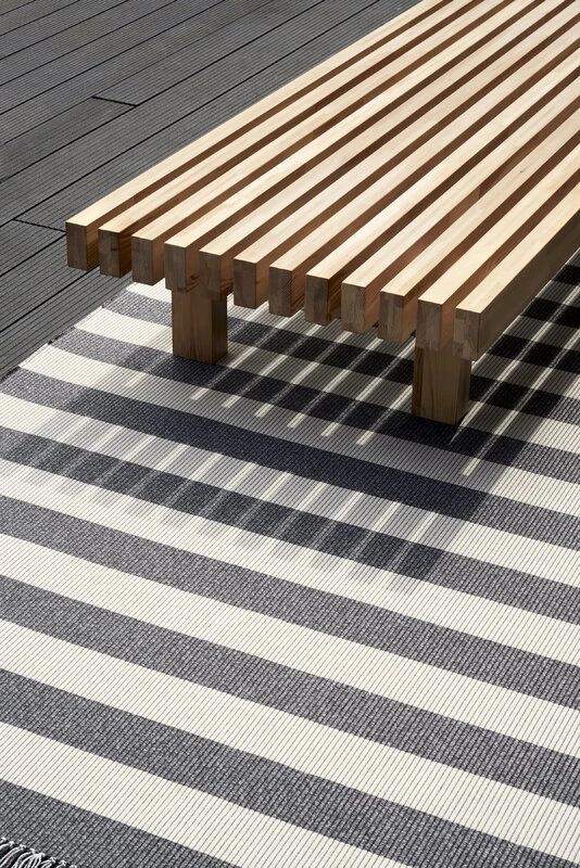 Der Big-Stripe-In-Out-Teppich von Woodnotes besteht aus feuchtigkeits- und lichtbeständigem Polypropylen und ist besonders gut für Küchen und Kinderzimmer sowie Balkone, Terrassen und andere Außenbereiche geeignet. Der Big-Stripe-Teppich eignet sich auch hervorragend für Poolbereiche oder Strandhäuser, da die Polypropylenfasern Chlor und Salzwasser trotzen.