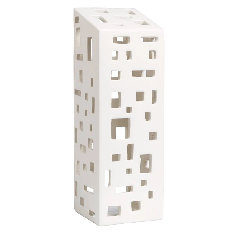 Die Hochhaus-Laterne aus der Serie Urbania von Kähler ähnelt einem Wohnhaus, dessen asymmetrische Fenster und schräge Decke für ein interessantes, unverwechselbares Aussehen sorgen. Die Oberfläche der Laterne ist wunderschön weiß verglast.