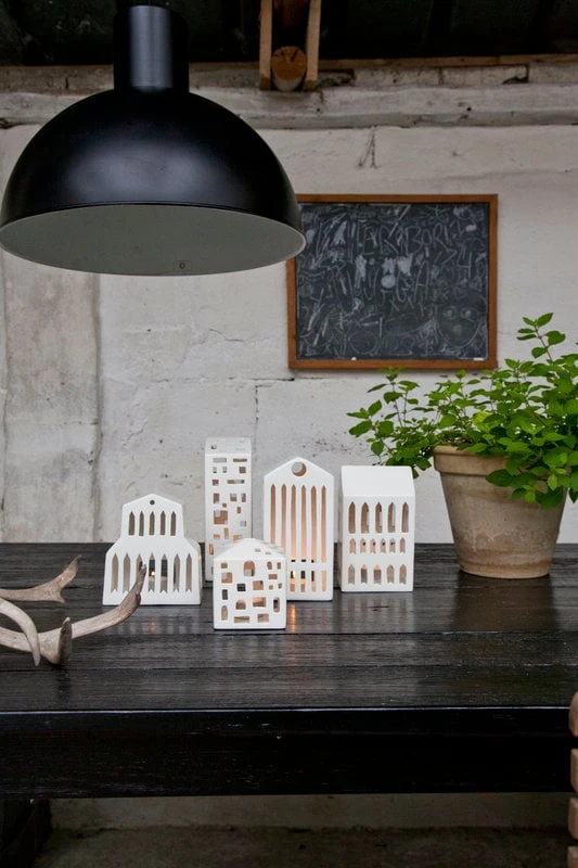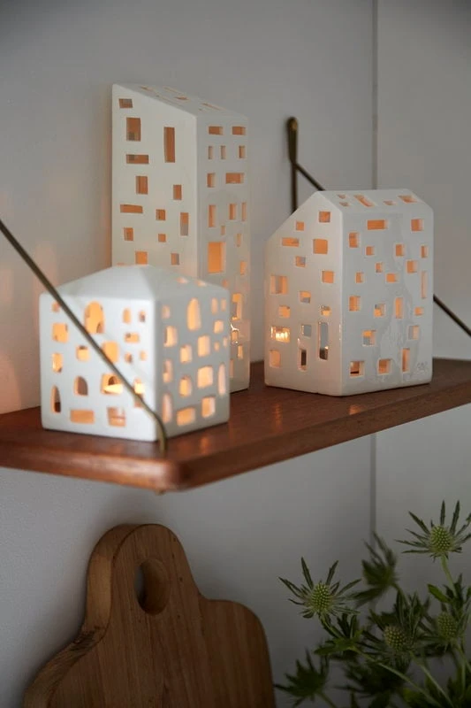 Kählers Urbania-Laternen bieten eine moderne Alternative zu traditionelleren Laternen. Die Keramiklaternen wurden von Mette Bache und Barbara Bendix Becker entworfen und stellen verschiedene Gebäude dar, durch deren unterschiedlich geformte Fenster Kerzenlicht strahlt, das faszinierende Muster auf ihre Umgebung wirft.