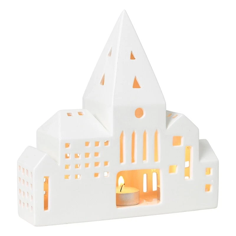 Die City-Laterne aus der Urbania-Serie von Kähler zeigt eine Reihe von städtischen Gebäuden mit einem hohen Kirchturm in der Mitte. Die Oberfläche der Laterne aus Keramik ist wunderschön weiß glasiert.