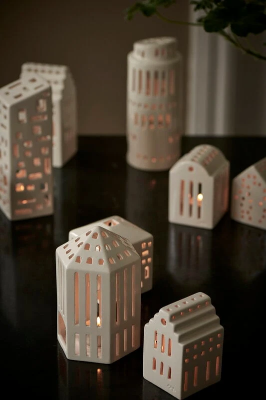 Kählers Urbania-Laternen bieten eine moderne Alternative zu traditionelleren Laternen. Die Keramiklaternen wurden von Mette Bache und Barbara Bendix Becker entworfen und stellen verschiedene Gebäude dar, durch deren unterschiedlich geformte Fenster Kerzenlicht strahlt, das faszinierende Muster auf ihre Umgebung wirft.