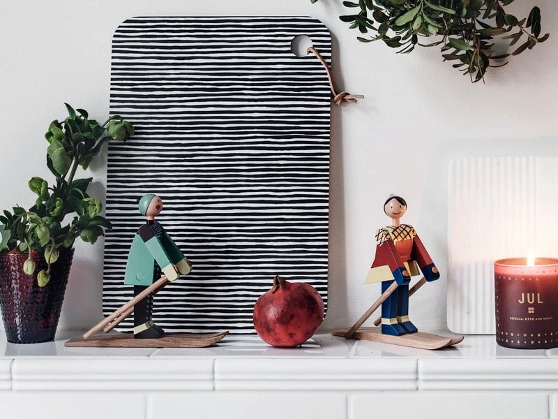 Datti und Boje sind fröhliche Ski-Holzpuppen, die Kay Bojesen in den 1940er Jahren entworfen hat. Die rotbäckigen Figuren wurden nach seinen Familienmitgliedern benannt – sein Sohn Otto wurde Boje genannt, und Datti war der Spitzname seiner Schwiegertochter Ruth. Die Puppen sind aus Buche gefertigt und mit Skiern, Skistöcken und leuchtenden Outfits ausgestattet.
