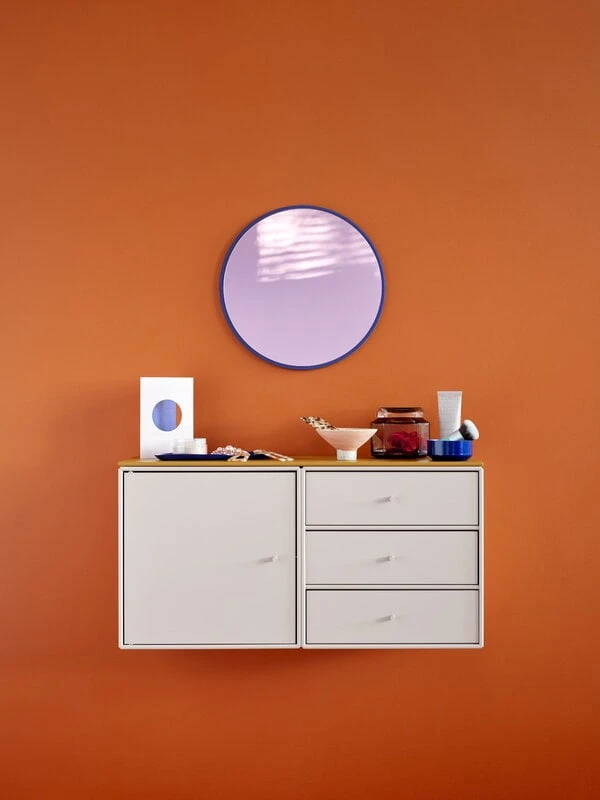 Der Montana-Mini-Spiegel besteht aus einem einfachen, geometrischen Spiegelglas, das auf einer lackierten MDF-Platte angebracht ist. Die Spiegel können einzeln oder in Gruppen an der Wand montiert werden und passen in Farbe und Form perfekt zu den Montana-Mini-Modulen.