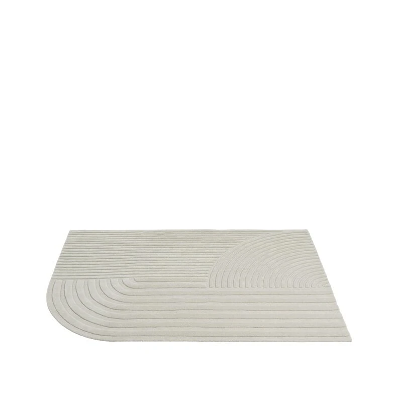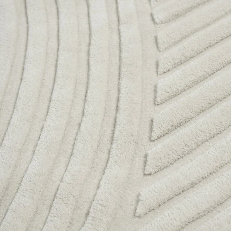 Der Relevo-Teppich wurde aus Wolle handgetuftet und dann in verschiedene Schichten geschnitten. Das Ergebnis ist ein vom Teppich ausgehendes dreidimensionales Muster. Das Muster spielt mit Schatten und kreiert so die Illusion eines zweifarbigen Teppichs – tatsächlich besteht der Teppich nur aus weißer Wolle. Eine einzige abgerundete Ecke krönt das sanfte Aussehen des Relevo-Teppichs.