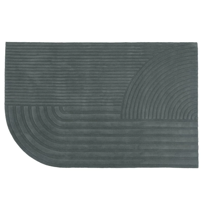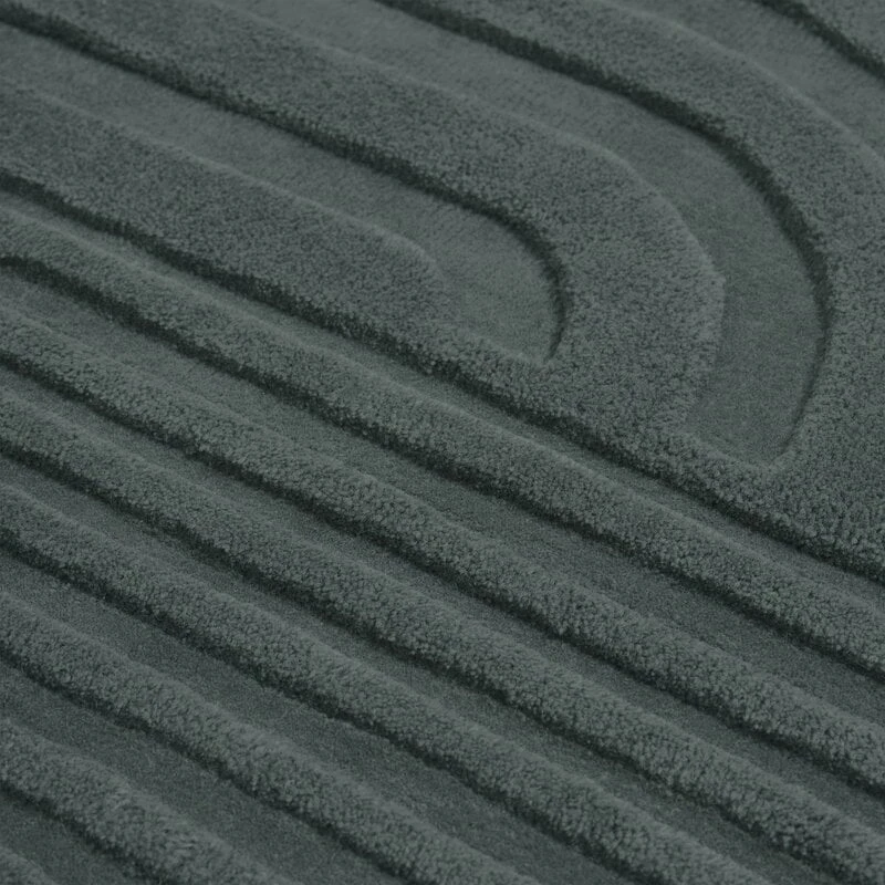 Der Relevo-Teppich wurde aus Wolle handgetuftet und dann in verschiedene Schichten geschnitten. Das Ergebnis ist ein vom Teppich ausgehendes dreidimensionales Muster. Das Muster spielt mit Schatten und kreiert so die Illusion eines zweifarbigen Teppichs – tatsächlich besteht der Teppich nur aus dunkelgrüner Wolle. Eine einzige abgerundete Ecke krönt das sanfte Aussehen des Relevo-Teppichs.