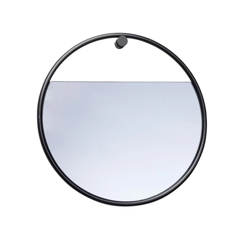 Der Peek-Spiegel von Northern ist ein charmanter runder Wandspiegel mit einem markanten, soliden Rahmen in Schwarz. Das silbern getönte Spiegelglas innerhalb des Rahmens füllt nicht die gesamte Fläche aus, sondern lässt ein Stückchen frei, wodurch die hinter dem Spiegel liegende Wand sichtbar wird – ganz so, also würde sie einen verstohlenen Blick (engl. „peek“) durch den Rahmen wagen. Der Effekt wird noch deutlicher, wenn der Peek-Spiegel an einer farbigen Wand befestigt wird.