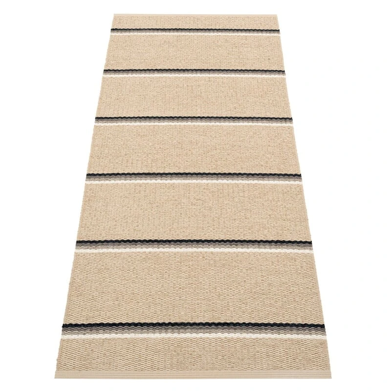 Der aus phthalatfreiem PVC-Band gefertigte Teppich ist sehr pflegeleicht und damit eine praktische Wahl für alle Räume, vom Kinderzimmer bis zur Küche. Dank seiner schmalen Form ist der Teppich auch ein idealer Flurläufer, und er kann sogar im Freien auf dem Balkon, der Veranda oder der Terrasse eingesetzt werden. Der im schwedischen Dalarna hergestellte Teppich wurde mit traditionellen Techniken gewebt und ist in mehreren Farbvarianten erhältlich.
