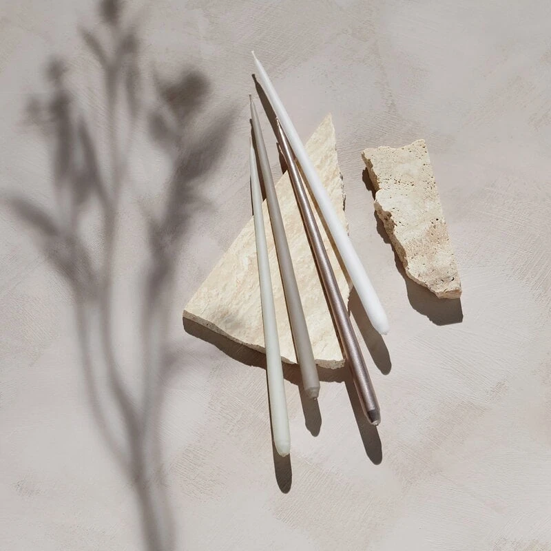 „STOFF Nagel by Ester & Erik“-Kerzen werden von einem dänischen Familienunternehmen namens Ester & Erik handgefertigt. Die Packung enthält 6 weiße Stabkerzen, die für die STOFF-Nagel-Kerzenhalter entworfen wurden.