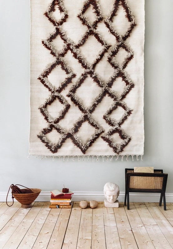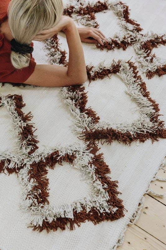 Der Teppich Tie von Finarte kombiniert die skandinavische Rya-Technik mit traditionellem Baumwoll-Flachgewebe – die Baumwolloberfläche kontrastiert mit flauschigen, kantigen Mustern, die dem Teppich einen verspielten Charakter verleihen. Der vom finnischen Duo Saana ja Olli entworfene Teppich Tie eignet sich als Wand- und Bodenteppich. Der Teppich Tie ist aus recycelter Baumwolle hergestellt und mit geflochtenen Enden versehen.