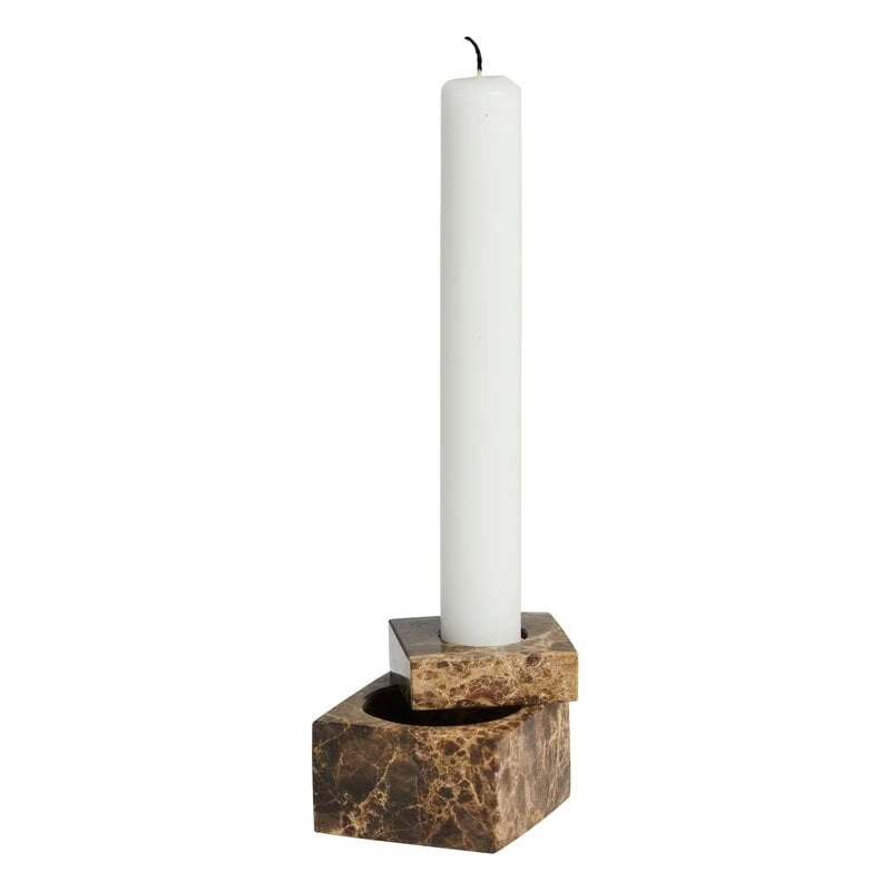 Der Kerzenständer wurde von Oleg Pugachev entworfen und besteht aus braunem Marmor. Das natürliche Material verleiht dem Ganzen eine reizvolle Individualität, da Muster und Farbe des Marmors von einem Kerzenhalter zum anderen variieren.